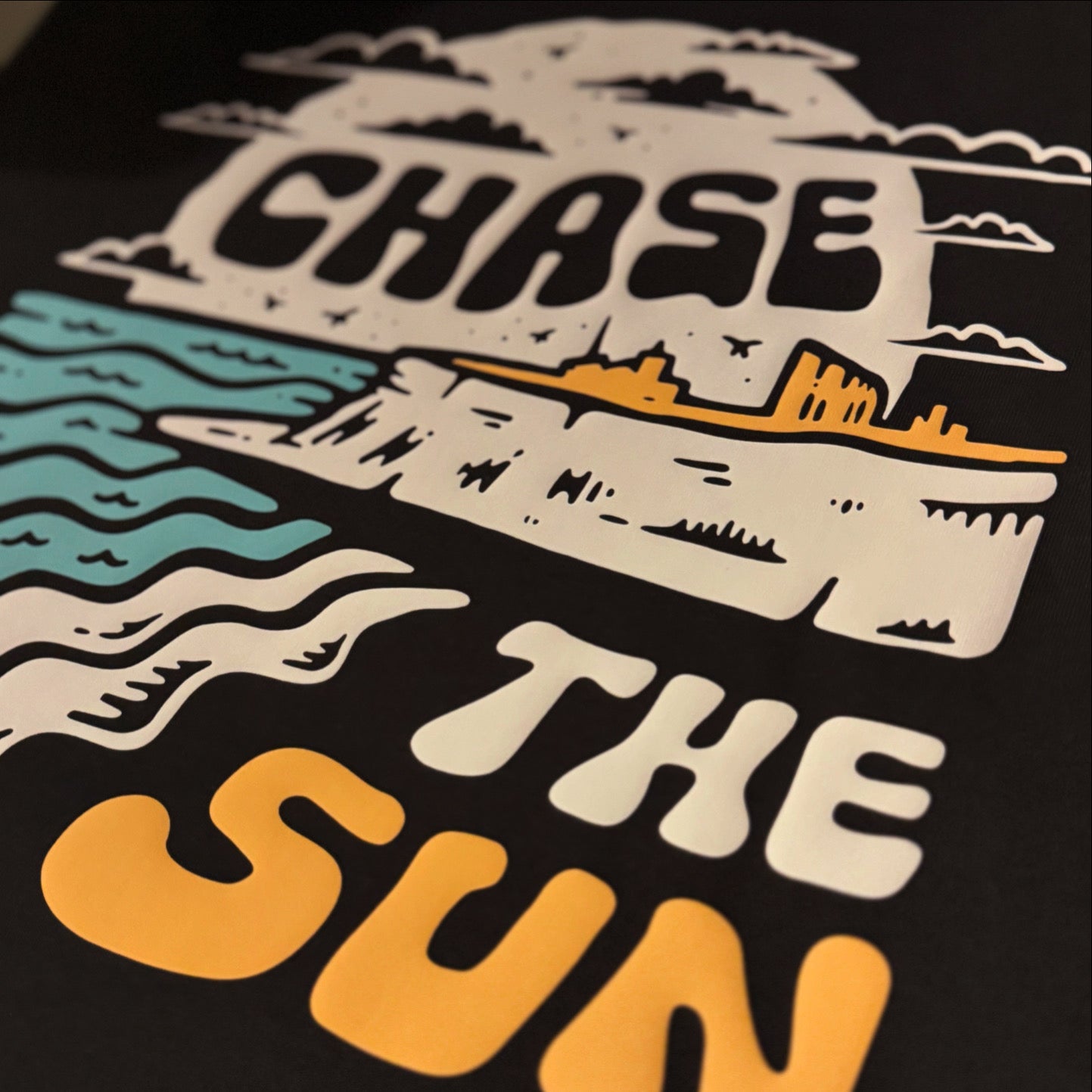 Organic “Chase the Sun” Tee. If you chase the sun long enough eventually it ends up rising back over the Priory.
